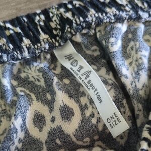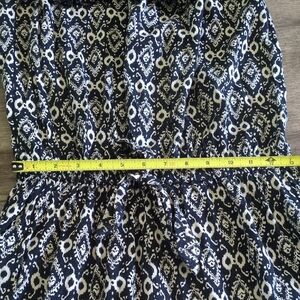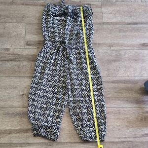 size is one size but can fit xs to medium. measures about 13" at waist but is stretchy. 42" total length. halter tie and waist tie detail with ruffles at top. cropped ankle. great condition, only worn once. no defects, smoke-free home. feel free to make an offer bundle to save or ask any questions.