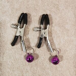 Brand new bdsm black faux leather fetish flogger set. This erotic set includes a black fetish faux leather teasing flogger and a set of jeweled nipple clamps.