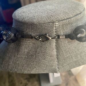 Graduated lucite beads wrapped in black fishnet. Lobster claw clasp B1