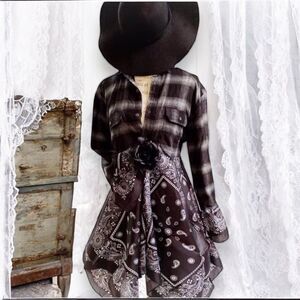 Strut your fashion style in black and white flannel with button-down long bell sleeves with asymmetrical hemline! Mid length boho western chic, festival lightweight layering. Featuring flowing black and white paisley, year-round wear. Wear it open for a relaxed look, button it up as a long tunic top, or cinch the waist for a more tailored silhouette. Embrace your free spirited fashion with lightweight layering flannel duster jacket! True Rebel!