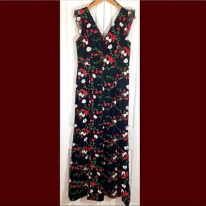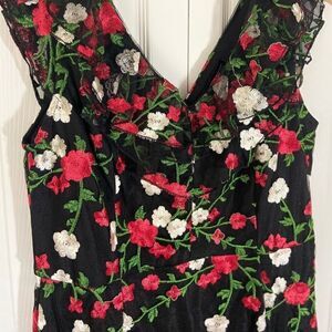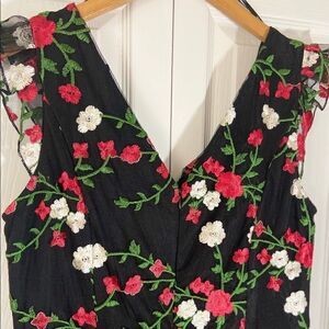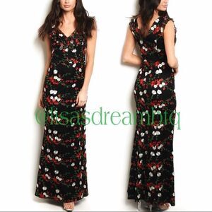 Stunning floor length black sleeveless dress with tulle overlay and embroidered floral design. V-neckline in front and back with pretty ruffle around shoulders and front neckline. Hidden zipper in back with hook/eye closure. Gorgeous high quality form fitting dress!
