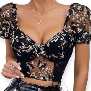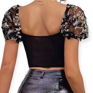 Black Gold Floral Embroidered Short Sleeve Plunging Neckline Bustier Corset Top