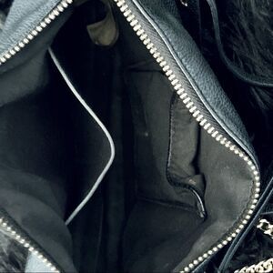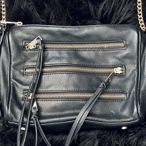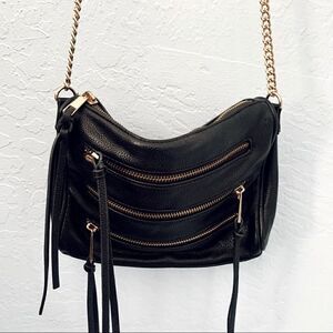 Cute small crossbody bag. Faux pebbled leather. Gold tone chain strap. Multiple gold tone zipper pockets on front with tassels. Single inside compartment with one large & one small pocket. Gold tone zipper closure with tassel.