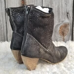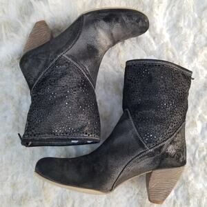 Black suede leather w/ gray silver shimmer patina. Shortie slouch booties (just above ankle). Slightly slouchy shafts have laser cut circle dots perforations. Rear zip, leather lining. Chunky wood heel has carved/scraped distressing. Issues noted in photos. Good preowned condition, overall. Size EU 40 by Lola Sabbia for Eric Michael. Style: Lago. No US size marked: Size chosen based on platform conversion charts.