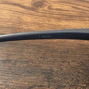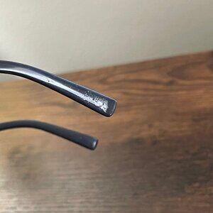 The eyeglass frames are in used condition with visible signs of wear. The temples show scuffing and scratches on the tips, and there are minor surface scratches on the plastic frame from previous handling. Hinges are intact and function properly. Overall, these black/gray round eyeglass frames remain durable, stylish, and ready for new lenses, making them a great option for everyday wear or a backup pair.