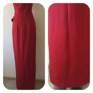 Blue dress measurements: bust 17”waist 13”,hips 17.5” The draped skirt has a flirty slit, and a flounced ruffle adds a playful touch.