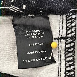 Black and white science chemistry print stretch denim shorts with buttons and zipper , cuffs