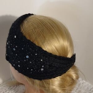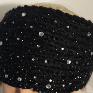 This black knit rhinestone studded ear warmer headband is a one size fits all. It has two large buttons on the back. In excellent preloved condition. All offers are welcome.