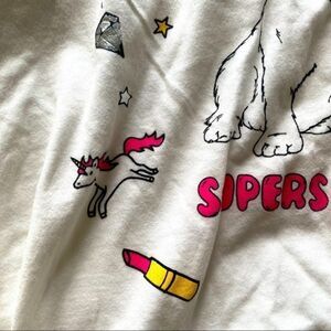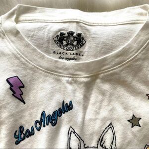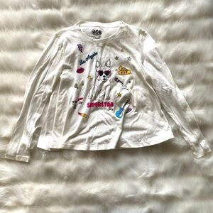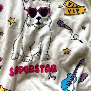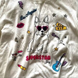 Juicy Couture Black Label long sleeve tee in white with the trademark dog featured on front with microphone, unicorn, diamond,kiss, VIP ticket, guitar, lipstick, thunderbolt & heart shaped sunglasses