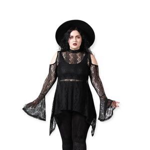 Black Lace Cold Shoulder Long Bell Sleeve Tunic Uneven Hem Mesh Top - NEW