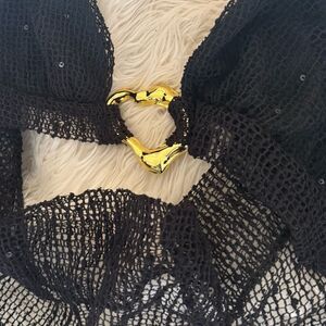Elegant black lace halter top featuring a striking gold accent. Perfect for a night out.