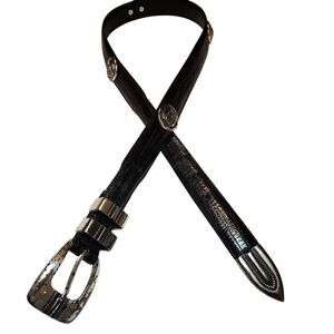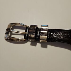 Vintage black leather belt featuring a silver buckle and accents. Rare find,unisex.