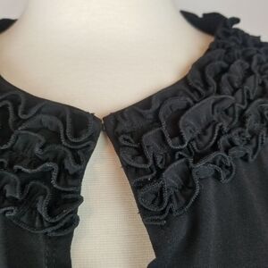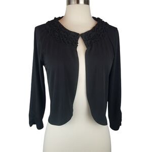 Black cardigan, polyester/spandex. Size S. Approximate measurements are pit to pit 18". Length is approximately 18". Sleeves are approximately 18". Sleeves have some rouching on them. Very nice condition. Would go cute with a skirt or jeans.