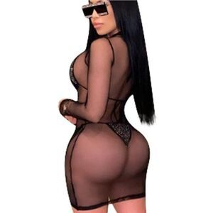 Black Long Sleeve Mesh 3PCS Rainstones Club , Lingerie , Swimwear, sz Large