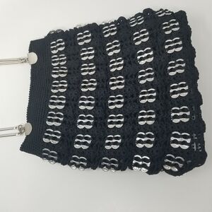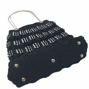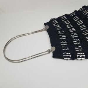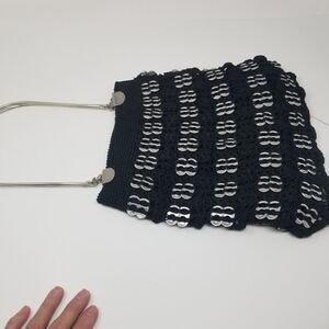 Black Macrame shoulder bag with POP TABS woven into design. Approximate measurements are 11.5" x 12" x 3.5". Very good condition. Metal handles. Very art decoration.