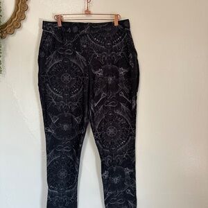 BlackMilk fleece lined cozy pull on pants featuring a zodiac-themed print in black and gray. These pants are an ankle length (depending on your height) and are more of a trouser silhouette, versus a skinny legging. Generously sized through the thigh. Front pockets.