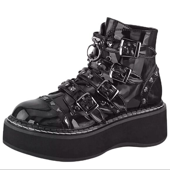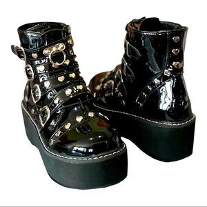 NEW Black patent leather combat boots! Platform boots, lace up, round toe cap, multi silver buckles and studded hearts, inner shaft zip up platform boots!