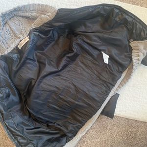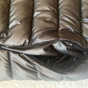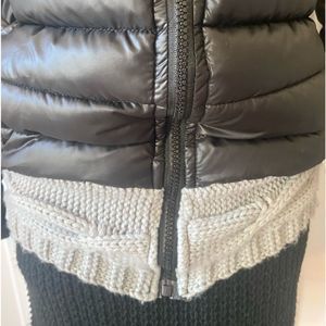 Cute black puffer jacket with sweater hood. Also has band of sweater material at the bottom. Size 4/small. Has 2 pockets with zipper closure. Material is polyester/ polyamide. Approximate measurements laying flat. -