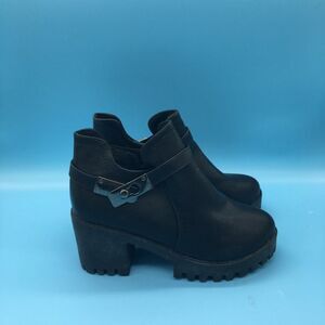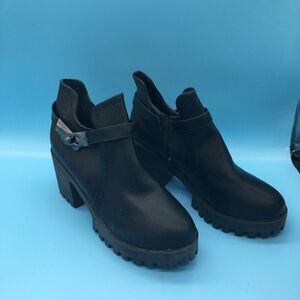 Black Round Toe Platform Ankle Boots Chunky Mid Heels with Side Zipper