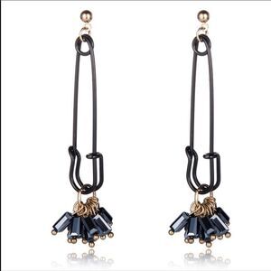 Gold post earrings long black safety pins (open or close) black seed beading completes the look!