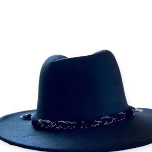 Elevated your ensemble with silver and black chains braided band, skulls, coins, turquoise beads with hanging chain tassels accenting the tall dented crown, and stiff brim black western fedora hat.