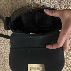 A normal sign of used Stuart Weitzman crossbody bag showcases a quilted black fabric and a striking gold-tone clasp, offering a sophisticated touch to any ensemble. Its compact, rounded design and adjustable strap provide both style and practicality, making it a perfect choice for various occasions.