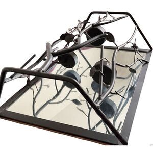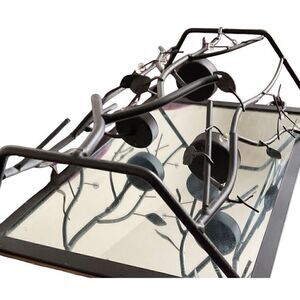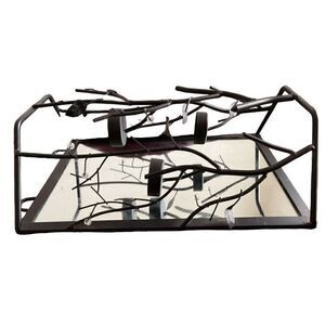 Mirror with wrought iron cage for tea lights. 3 tea light holders with leaves, twigs, and scattered clear beads. Darling embellished mirror. 11.75” X 8.5”