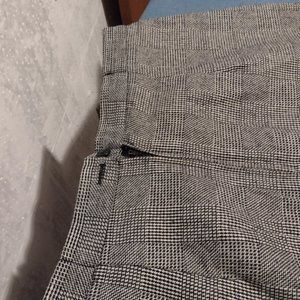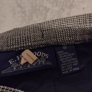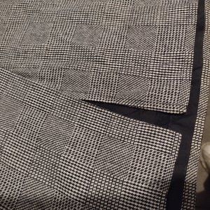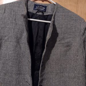 5 button down front jacket with 3 front pockets, fully lined both skirt and jacket. 30% wool, 40% polyester, 25% acrylic, and 5% other, lining 100% nylon. Split in back of skirt, zipper and button also in back. Jacket has 2 buttons on sleeve.