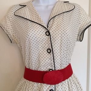 I found this beautiful vintage inspired dress at a sample sale in Manhattan a few years ago. It's a lovely, romantic ensemble perfect for brunch or a picnic. I wore it the day my husband proposed to me at majestic Palace of Fine Arts in San Francisco. Bundle with the red belt for the entire look. Mid-length, right above knees.