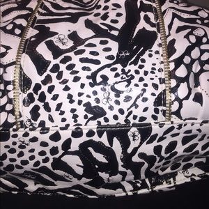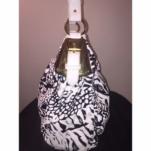 This Baby Phat Black/ White Printed Faux Leather Handbag has gold zipper trim down the front of the bag . It is gently used in great condition!
