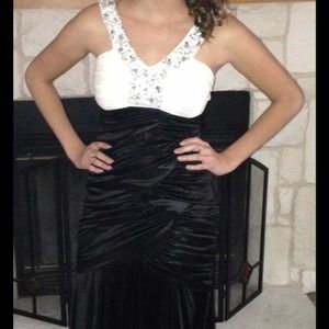 Black/White dress w/ white straps, w/ diamond neckline and strap. Mermaid style under buttox then flared down till the bottom of the dress. Worn once 3 pictures ❤️