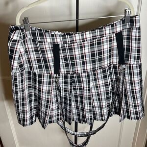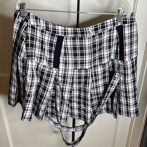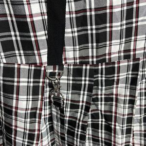 Warmer weather means time for new skirts! This one features a black, white and red plaid pattern, pleats, removable suspender straps and back zipper closure.