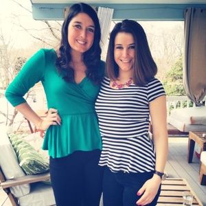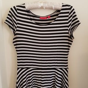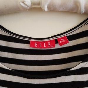 Such a flattering top! Short sleeved - almost capped. Synched at the waist. The stripes at the peplum are curved to create an illusion.