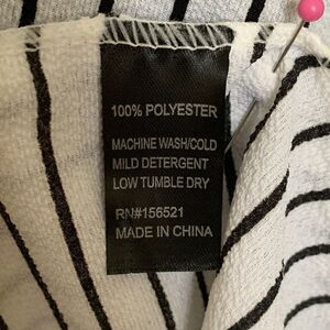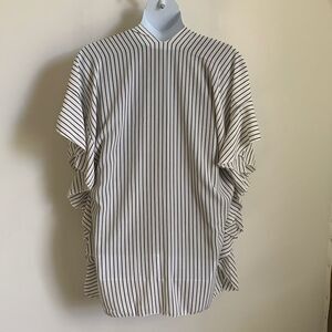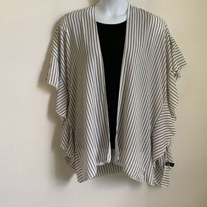 Loose flowing shawl with sleeves that form a ruffle on the side of shawl. Black & White stripes. Fabric content is 100% polyester. Length measured in the back from top to bottom is 33" Shawl has never been worn.