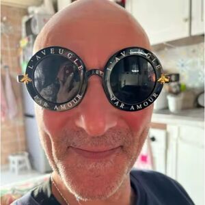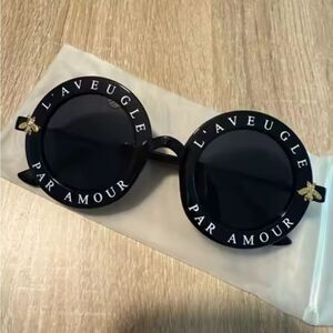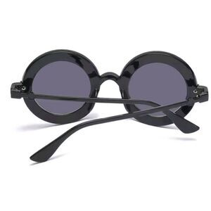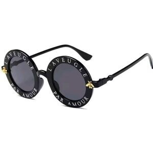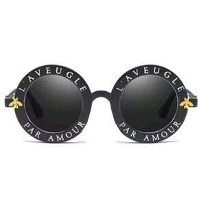 These statement sunglasses boast a bold black frame adorned with gold-tone metal accents, creating a luxurious and artistic look. The dark tinted lenses enhance the vintage-inspired design, making them a perfect accessory for any stylish occasion.