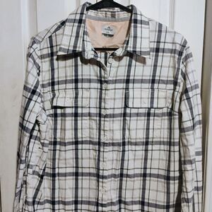 This top showcases a timeless black and white palette with a notched collar and a boxy silhouette. Its long sleeves and button-down design offer a versatile style suitable for various occasions.