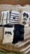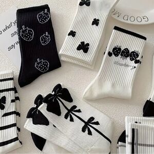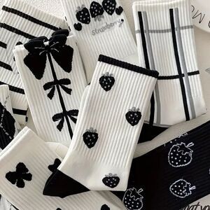 Set of black and white socks with various patterns including strawberries, bows, and stripes.