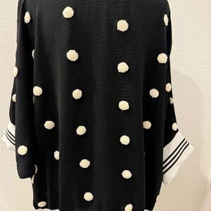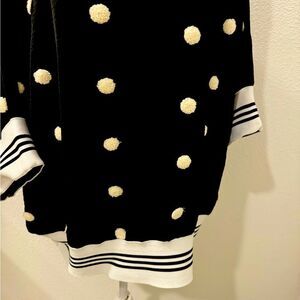 Stylish black sweater with white polka dots. Features a V-neck and striped accents.