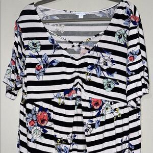 This relaxed t-shirt features a classic black and white striped with vibrant florals The short sleeves and comfortable fit make it perfect for everyday wear. Ideal for those seeking a blend of casual elegance and comfort.