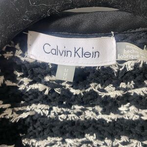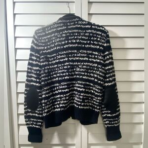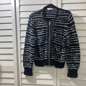 Stylish black and white striped knit jacket with a zip closure. Perfect for layering.