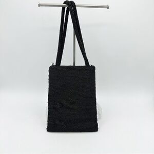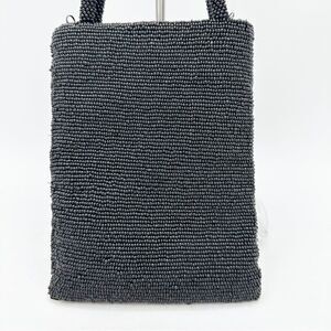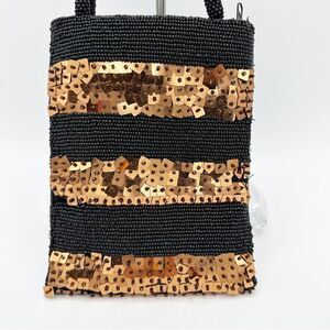 Black seed beads everywhere, with three striped of beaded quart copper sequins on one side. Even the handles are beaded! Great size for hands free phone at parties or cocktails. Satin lined. Zip closure.