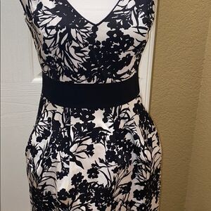 Beautiful black and white floral pattern, side pockets, pleated below the black band. Size 6 97% Cotton 3% Spandex