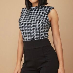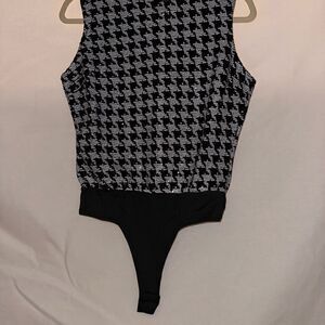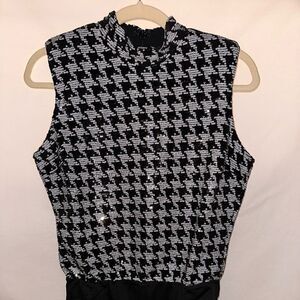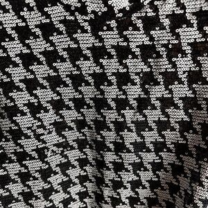 Refresh your style with our Black and White Houndstooth Sequin Bodysuit. Mock neck bodysuit with houndstooth print throughout, zip closure at neck, thong cut bottom and button closure 95% polyester 5% spandex