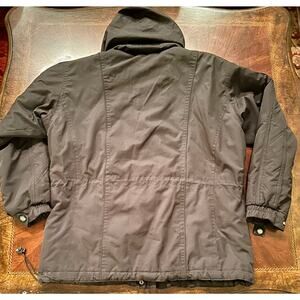 Solid black, plenty of pockets, quilted sleeve panels, hood zips into collar if you don’t want a hood.