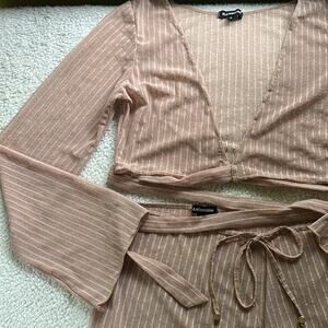 Top is a crop style wrap top with long ties that cross over the body, and cute flared sleeves