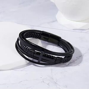 Black cross on multi layered leather bracelet, titanium steel clasp