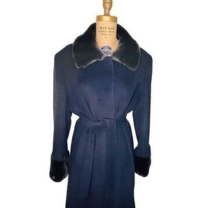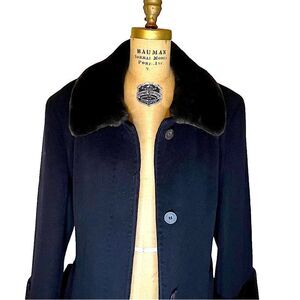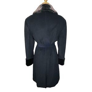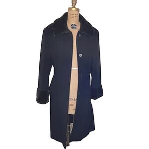 Black 100% wool coat with faux fur collar and cuffs from Calvin Klein with tie waist. Super soft faux fur and super luxurious woven wool fabric.