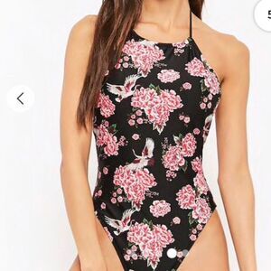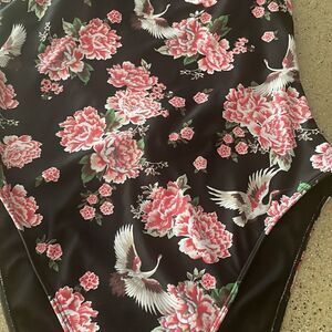 Pretty and feminine Black halter neck one piece swimsuit with roses and cranes print. Open back, high cut leg, cheeky bottom. Very feminine and sexy! Suit is new without tags, no flaws to note.