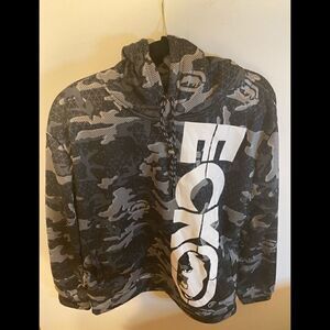 Fit and stylish high - density hoodie with Camo allover print large, Ecko graphic vertically down chest . Adjustable hood too front pockets. 100% polyester. New with tags