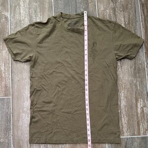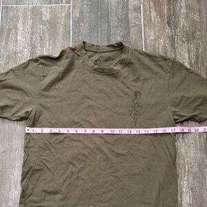Bold olive tee featuring a striking graphic of a skeletal statue. Perfect for making a statement.